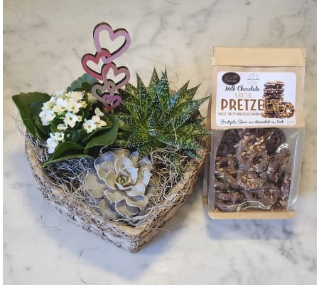A pretty mix of succulents in a heart-shaped concrete planter accented with a heart pick, complimented by a decadent pouch of Skor inspired chocolate covered pretzels. Definitely checks all the boxes for a great gift.