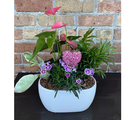 Pretty mix of tropicals that include a pink anthurium and a flowering dianthus. All arranged in a pretty dotted white ceramic